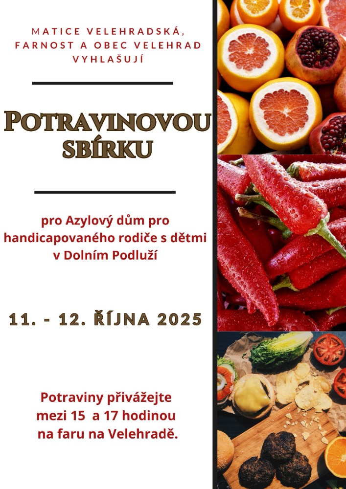 v minulém roce vyhlašují Potravinovou sbírku pro Azylový dům pro handicapovaného rodiče s dětmi v Dolním Podluží ve dnech 11. - 12. října. Potraviny prosíme přivážejte mezi 15- 17 hodinou na faru na Velehradě. Plodiny zahrad a polí jsou velmi vítány. Vše bude odvezeno přímo do domova.